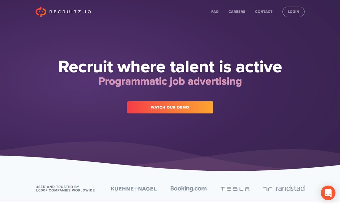Recruitz 這個網(wǎng)站就將首屏頂部紫色背景的下邊緣設計成為波紋曲線,這種非規(guī)則的視覺元素會讓用戶不自覺地注意到,而又不具備侵略性。多層波紋曲線讓背景擁有了層次,用戶視線自然下探過程中,會不自覺地被漸變橙色的CTA按鈕吸引。當然,色彩的選取也起到了一定程度的作用,但是波紋曲線也功不可沒。