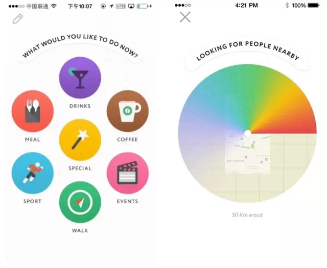 Yep是一個基于地理位置的交友a(bǔ)pp,用戶可以發(fā)起一個聚會,吃飯、喝茶、運(yùn)動或者其他什么。比如用戶選擇了“就餐”,其他選項(xiàng)收縮淡出,“就餐”圖標(biāo)移位并變成地圖上的一個圖釘?!熬筒汀眻D標(biāo)的變化過程可以將前后兩個界面無縫的銜接起來,闡明了基于地理位置的篩選機(jī)制,表達(dá)出“在這個位置就餐”的明確概念。在地圖界面中點(diǎn)擊“OK”按鈕,界面元素淡出,地圖整體向后退去,融入到雷達(dá)一樣的動效當(dāng)中,圓形掃描區(qū)域所代表的就是以用戶當(dāng)前位置為中心的50 公里半徑范圍。這一連串的動效,實(shí)現(xiàn)了界面之間的平滑過渡,也闡明了應(yīng)用所要表達(dá)的邏輯。
