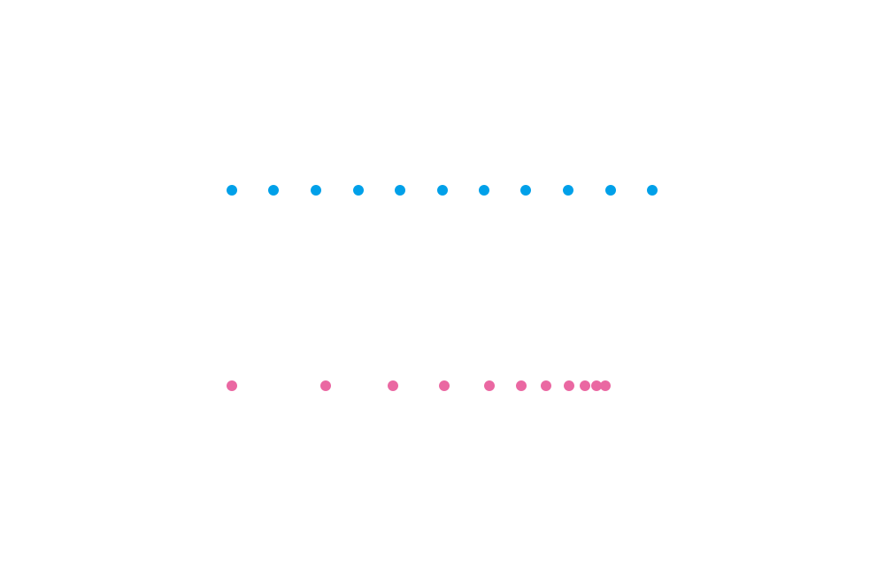 一條線也并不拘泥于就是平直的線條形式,只要能連綴成串的,我們都可以把它看成一條線,它就能在構(gòu)成中發(fā)揮起線的作用。藍(lán)色的圓點均勻分布,組成一條非常平靜的運行軌跡線,紅色的圓點具有漸變的節(jié)奏,它們組成的線條則帶著幾分變速之感。