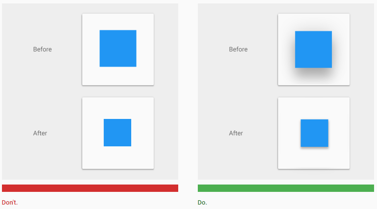 隨著控件高度的提升,元素在視覺上離用戶更近,顯得更大,而陰影變則變得柔和并擴散開來,當(dāng)控件下降之后,視覺上會變的更小,而陰影也緊貼到元素周圍,并顯得更加緊實。