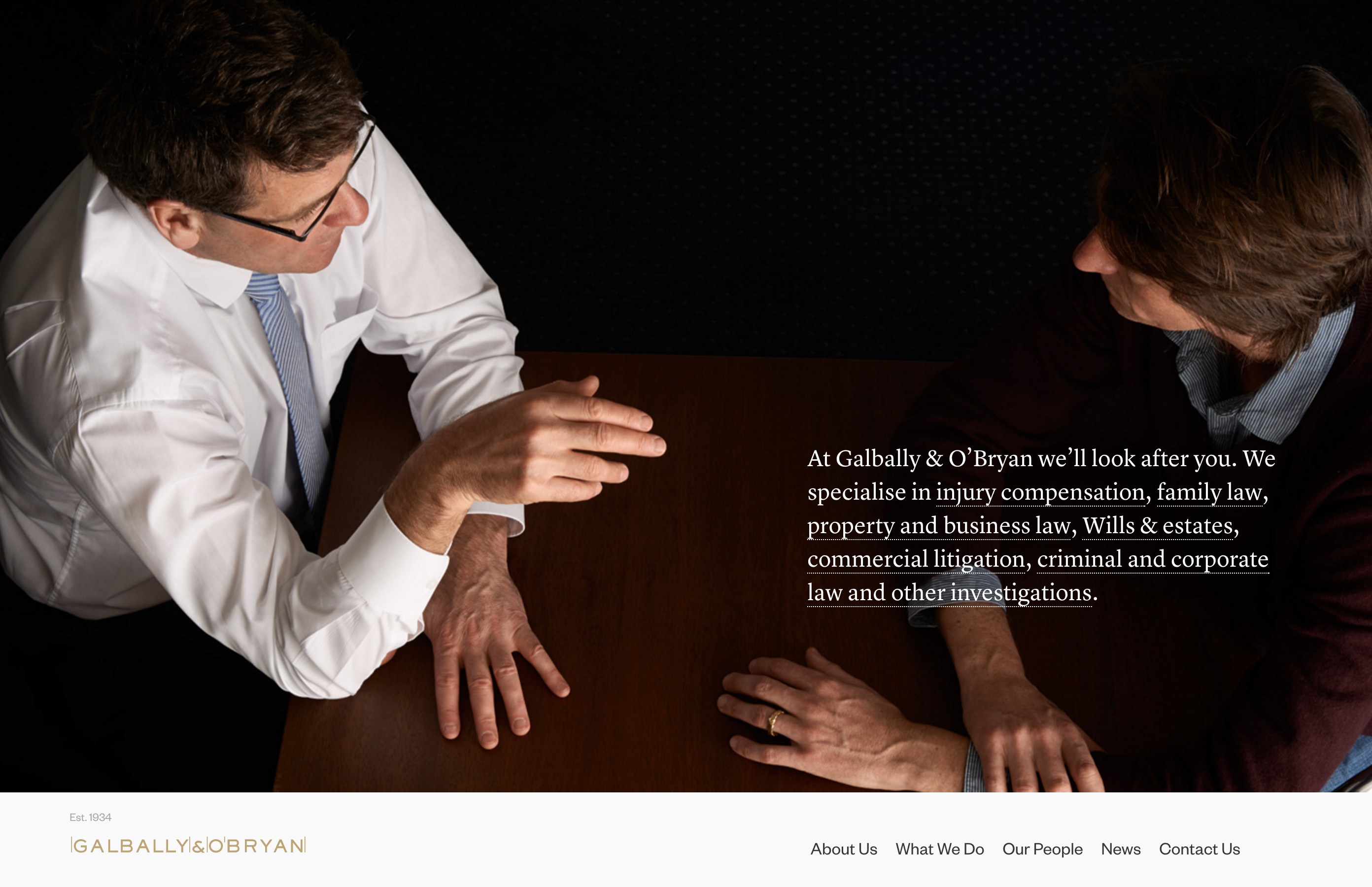 案例二:GALBALLY & O’BRYAN’S 首頁(律師事務(wù)所),作為一個(gè)堅(jiān)持高質(zhì)量且有一定聲譽(yù)的法律機(jī)構(gòu)。它的視覺設(shè)計(jì)是干凈利落、優(yōu)雅且高度專業(yè)的。想象一下要是與案例一的視覺系統(tǒng)交換一下,將會(huì)帶來什么影響?